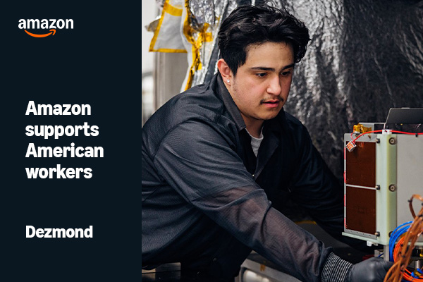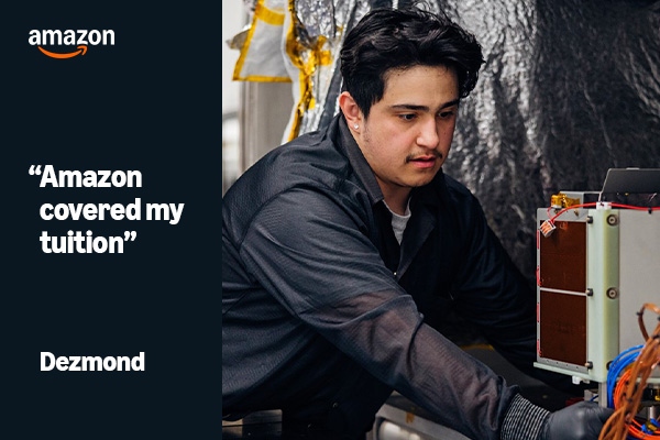 “I started out at Amazon as a basic warehouse associate. I was always interested in space as a kid, so when I heard about Amazon offering free satellite technician training, I signed up,” he said. Since completing his Satellite Technician Certification, Dezmond works for Amazon’s Project Kuiper.