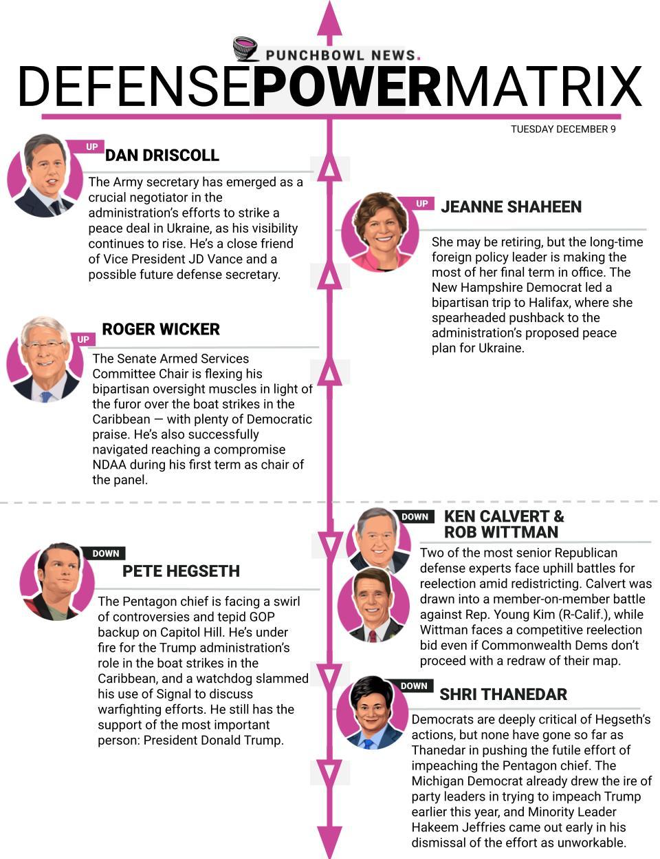 — The quintessential Punchbowl News Power Matrix for who’s up and who’s down in the defense space in Washington.