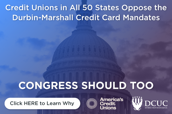 CREDIT UNIONS IN ALL 50 STATES OPPOSE THE DURBIN-MARSHALL CREDIT CARD MANDATES: The Durbin-Marshall Credit Card Mandates would create harmful new routing mandates on credit cards that would put consumer data and access to credit at risk. The threat of Durbin-Marshall to small financial institutions is so clear that credit unions across America are opposed to the mandates. Our message to Congress is simple: on behalf of over 140 million credit union members across America, commit to opposing the Durbin-Marshall Credit Card Mandates. Lawmakers should stand with their local credit unions and the communities we serve.