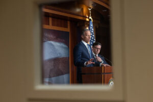 We spotted Reps. Patrick McHenry (R-N.C.) and Maxine Waters (D-Calif.) enter the majority leader’s office shortly after the Japanese prime minister’s joint address to Congress this afternoon. The House lawmakers pitched Schumer on their unreleased, still-to-be-finalized stablecoin package, according to a source familiar with the meeting.